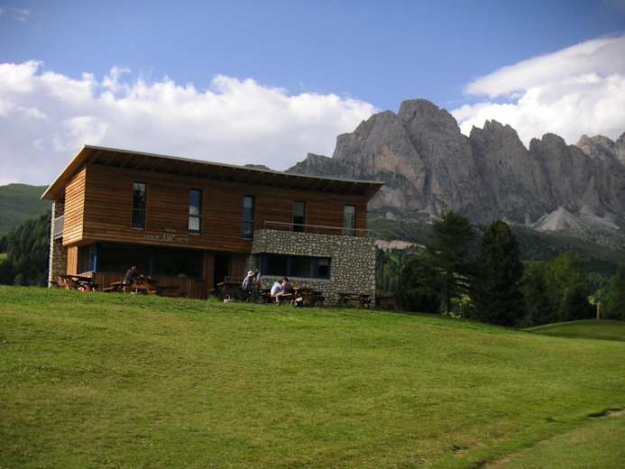 Schuatsch-Hütte (Rifugio Juac) mit Geislergruppe Foto: Josef Melchart
