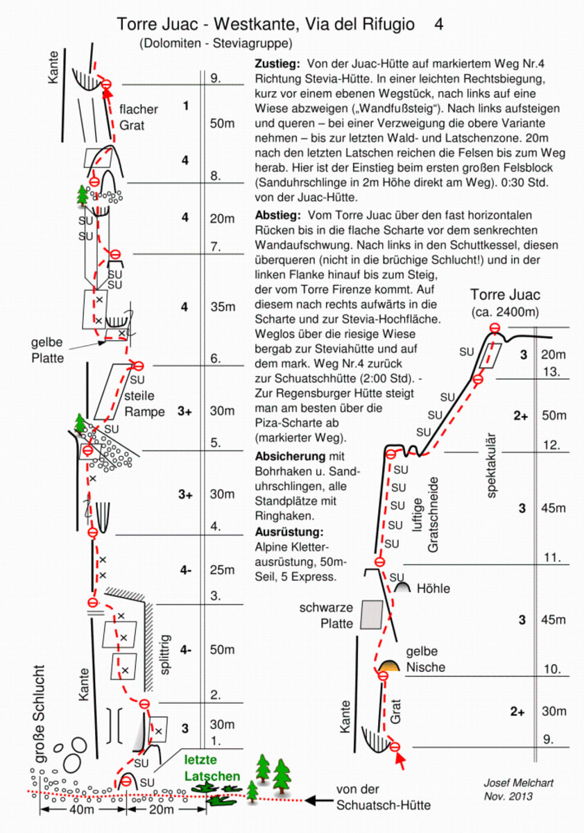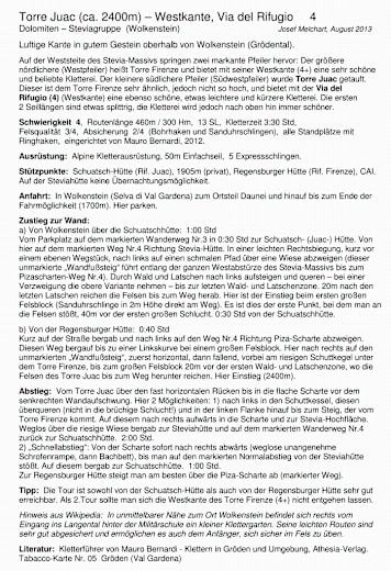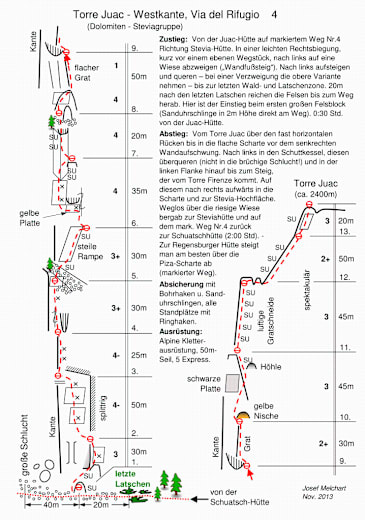 Von der Regensburger Hütte kurz auf der Straße bergab und links auf den Wanderweg Nr. 4 Richtung Piza-Scharte abzweigen. Diesen Weg bergauf bis zu einer Linkskurve bei einem großen Felsblock. Hier nach rechts auf den unmarkierten „Wandfußsteig“, zuerst horizontal, dann fallend, vorbei am riesigen Schuttkegel unter dem Torre Firenze, bis zum großen Felsblock 20 m vor der ersten Wald- und Latschenzone, wo die Felsen des Torre Juac bis zum Weg herunter reichen. Hier Einstieg (ca. 2.400 m).