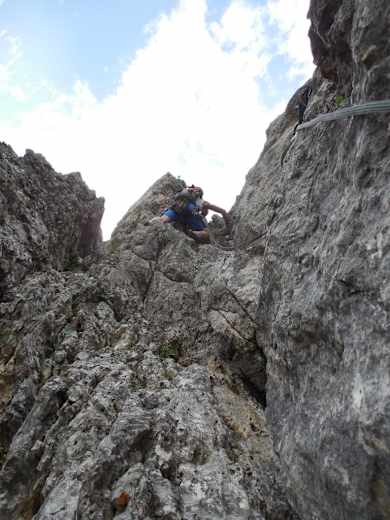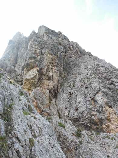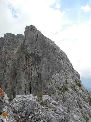 Abstieg: Vom Torre Juac kurz bergab und über den fast horizontalen Rücken bis in die flache Scharte vor dem senkrechten Wandaufschwung. Hier 2 Möglichkeiten: