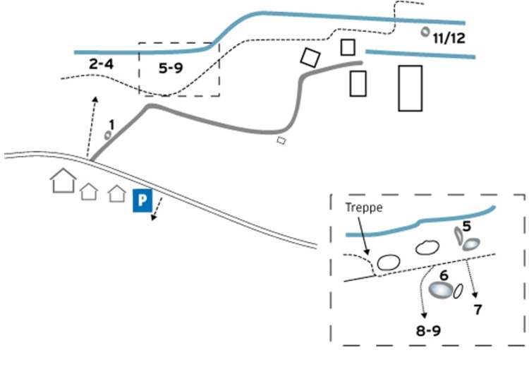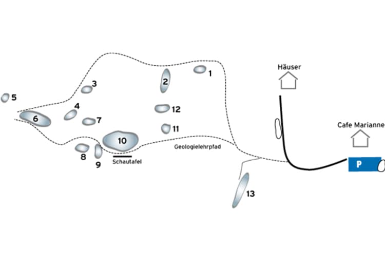Oder: Vom genannten Parkplatz links über die Brücke und ca. 400 Meter der Straße folgen bis zum Café Marianne. Gleich hinter dem Café ist ein ausgewiesener Parkplatz mit einer Übersichtstafel über den Geologielehrpfad.