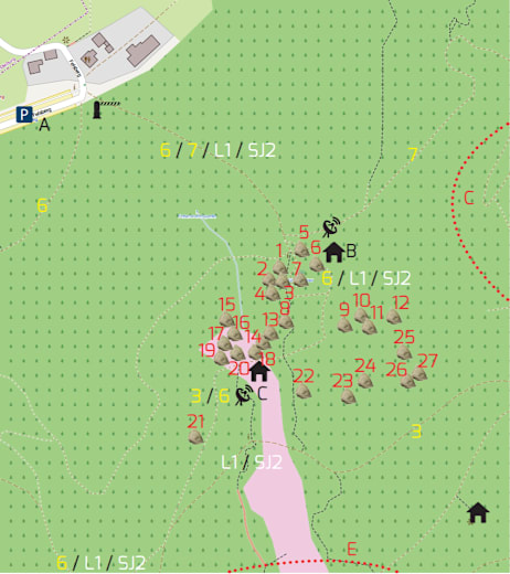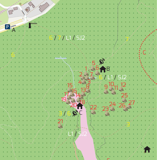 Vom Parkplatz Ohlyturm folgt man den Wanderwegen Nummer 6, 7, L1, SJ2 in südliche Richtung (Schranke).