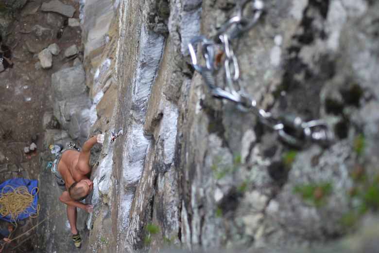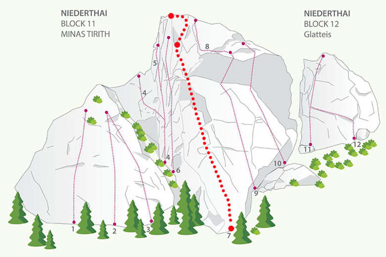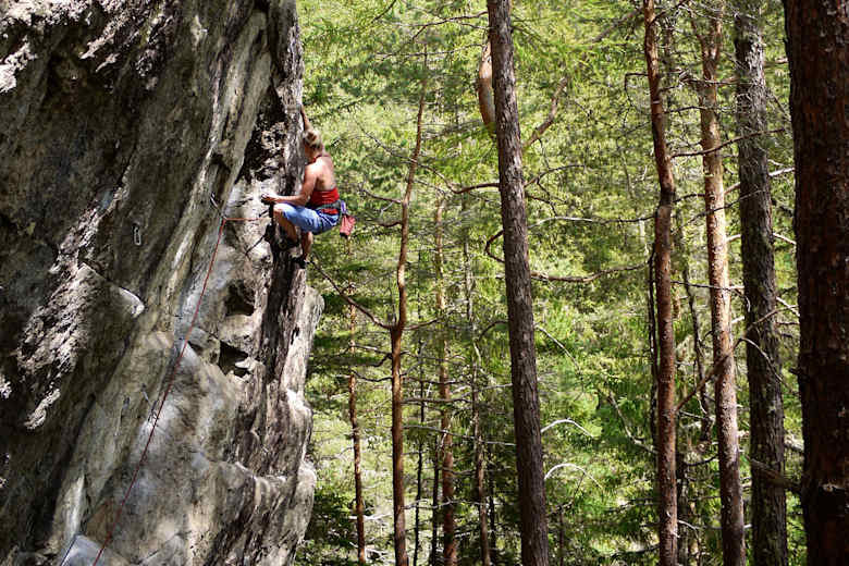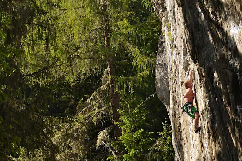 Seilklettern in Niederthai im Ötztal. Kilians Favorite heißt Minas Tirith: ausgesetzte Kletterei, bei der im Grad 8b Kraft und Präzision gefragt sind. Es gibt mehrere Sektoren, somit kann man sich meistens ein ruhiges Platzl aussuchen. Da die Wände auch unterschiedlich ausgerichtet sind, ist also Sonne und Schatten möglich – was auch manchmal die Nässe begünstigen kann. Klettern kann man hier von Frühling bis Herbst - die idyllisch gelegenen Granitblöcke am Tauferberg bieten vielfältige Auswahlmöglichkeiten und die Crowd hält sich durch die verschiedenen Sektoren in Grenzen.