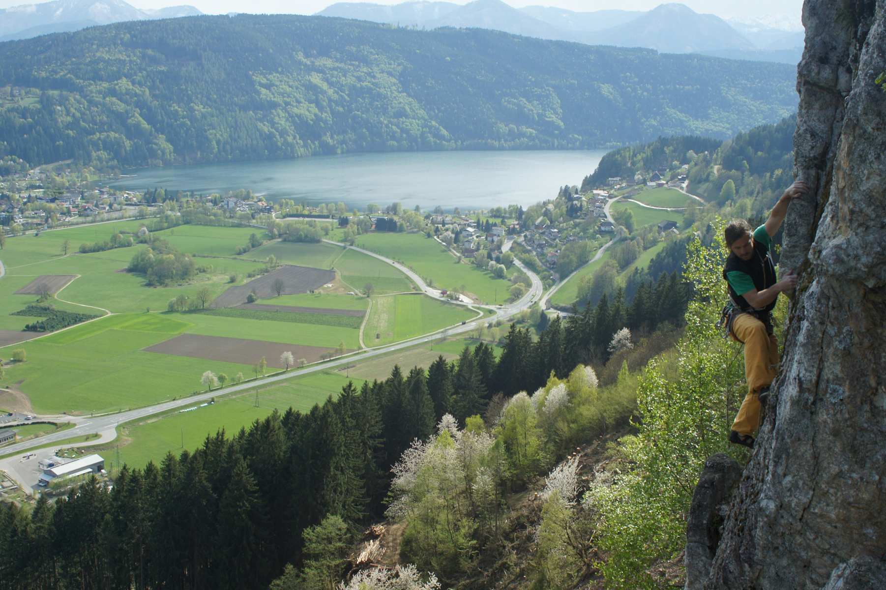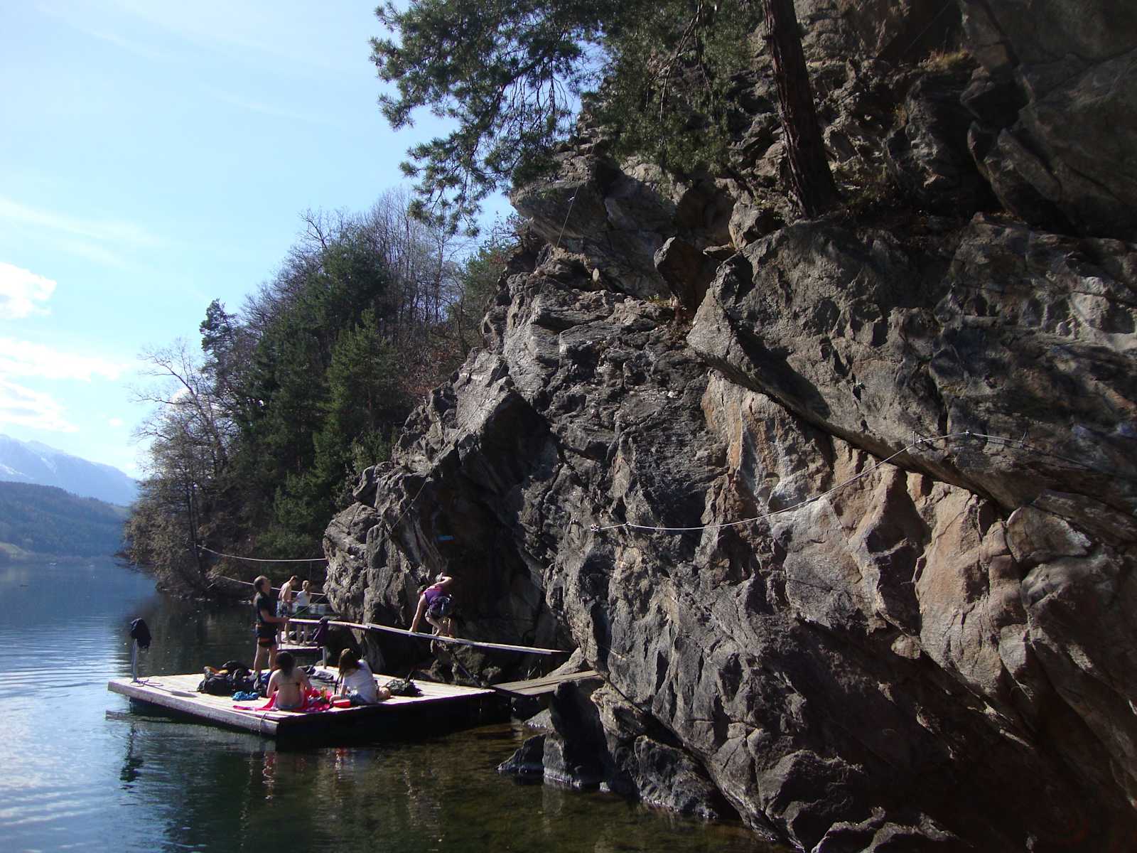 Klettergarten Jungfernsprung - Klettern und Baden am Millstättersee in Kärnten: Der Jungfernsprung bietet ein spektakuläres Ambiente. Die Wand liegt direkt am See, gesichert wird vom schwimmenden Floß. Baden und Klettern „at its best“ - die Kulisse ist wirklich einmalig. Kletterer der mittleren Schwierigkeitsgrade finden hier die passende Spielwiese. Insgesamt eine lohnende Kletter- und Badegelegenheit. Der Blick vom Jungfernsprung geht in Richtung Karnische Alpen und reicht vom Goldeck, über Staff bis zum Dobratsch.
