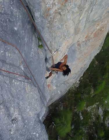 Über Wand 25m bis unter gelbe Überhänge. 18m schräg links und dann noch 10m queren zu Stand. Über Wand wieder gerade 30m hinauf bis unter großen Überhang. 12m rechts queren bis zu Block, von dort 12m schräg links bis oberhalb des großen Überhangs. Über Wand 25m hinauf, dann noch 30m gestuft zum Fuß eines 28m hohen Doppelrisses. In diesem hinauf. Von seinem Ende 25m nach rechts zum Beginn eines seichten Risses. Über Wand 30m zu kleiner Grasterrasse. In Kamin 60m auf die NW-Kante. Daran 30m zum Gipfel.