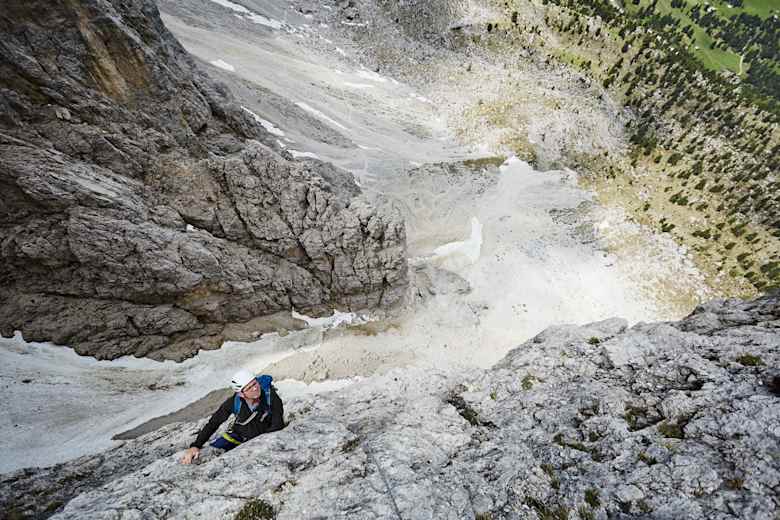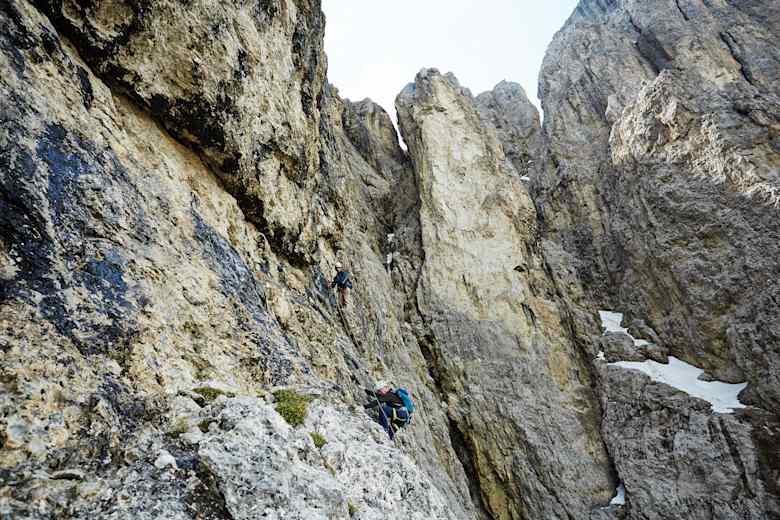 Für klassische Touren in den Dolomiten empfiehlt es sich einen Satz mittlerer Friends, Klemmkeile, verlängerbare Express-Schlingen und Bandschlingen für Standplatzbau und als Sicherungsmittel mitzunehmen.