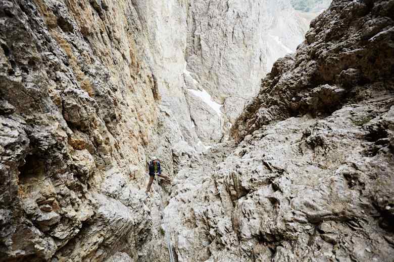 Der Einstieg befindet sich 30m links der Schluchtrinne zwischen 3. und 4. Sellaturm, hinter dem einzigen großen Block vor dem Wandfuß.