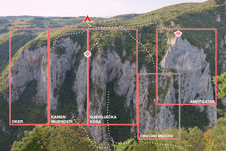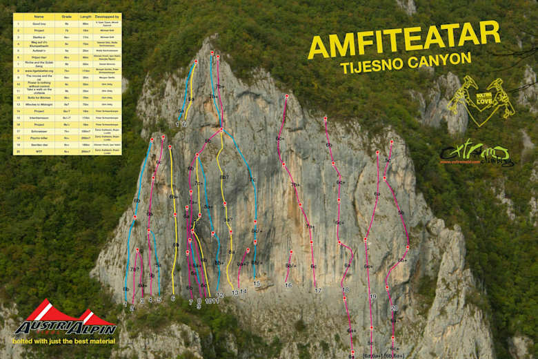 Der Sektor Amfiteatar ist der am dichtesten erschlossene Sektor des neuen Klettergebiets. Es bestehen derzeit 17 sehr gut abgesicherte Mehrseillängenrouten zwischen 6b und 9a (2-7 Seillängen) und ein paar reine Sportkletterrouten. Fast alle Routen sind vom Wandfuß aus begehbar und die ersten Seillängen als Sportklettertouren kletterbar. Der Zustieg zu den längeren Routen im linken un rechten Wandteil erfolgt über Abseilstellen in der Mitte des Sektors oder durch Zustieg von der Straße aus. Mehr Infos auf Anfrage.