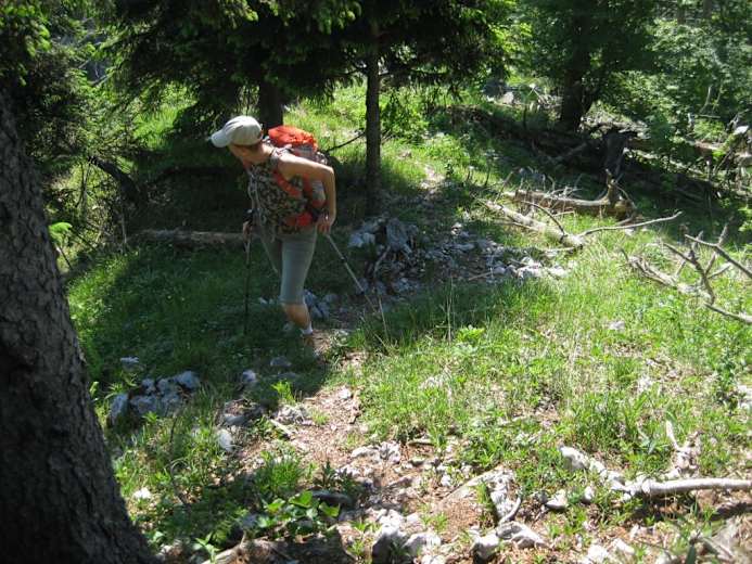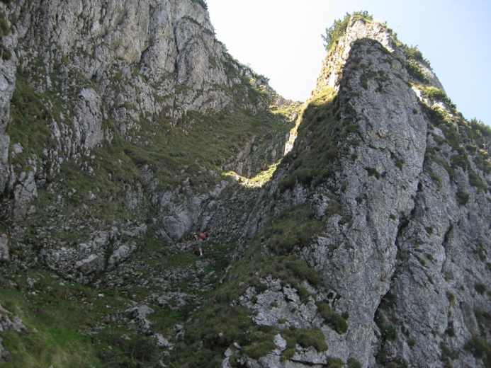 Von der „Hohen Scharte“ den Steigspuren entlang des Ostgrates folgen. Man hält sich fast immer in Gratnähe. Teilweise sehr steiles Gras, später einige leichte Kletterstellen auf überraschend festem Fels. Nach dem Steigbuch verschärft sich der Grat und bietet ein paar sehr ausgesetzte Stellen. In der Scharte auf 1.590 m wechselt man auf die Nordseite, steigt dort kurz ab und quert in die „Grüne Gasse“. Dies ist die Schlüsselstelle der Tour: Abschüssiger, erdiger Fels und das Fehlen von hinterschnittenen Griffen machen diese Passage bei Nässe zu einer ernsten Gefahr. Durch die nordseitige Lage ist die Rinne tatsächlich oft feucht, und der Schnee hält sich lange. Eine Seilsicherung ist hier fast unmöglich.