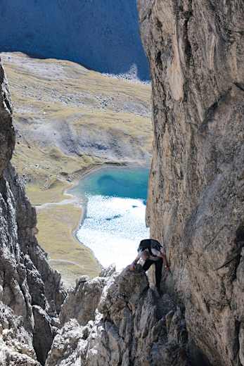 Normalweg-Klettern in den nördlichen Kalkalpen überm Steinsee in Tirol: Ein ausgesprochen schöner, wegen des festen, griffigen Felses, der großartigen Landschaftsbilder Tirols und der durchgängigen Markierung oft gemachter Anstieg.