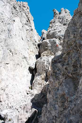 Das Band wird leicht ansteigend etwa 50 m verfolgt, dann geht es nach links über gestuften, festen Fels in der Südwand nach oben, II. In den folgenden Rinnen liegt viel Schutt und vereinzelt auch ein loser Block, hier ist Vorsicht angesagt, insbesondere dann, wenn mehrere Bergsteiger durch eine Rinne auf-/absteigen.