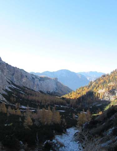 Nun ansteigend weiter auf dem markierten Weg zwischen Latschen, unterbrochen von kleinen Wiesenflächen, zum fast senkrecht sich erhebenden Felsaufschwung unterhalb der Parzinnalpe und weiter zur dort in 1.922 m liegenden Hanauer Hütte.