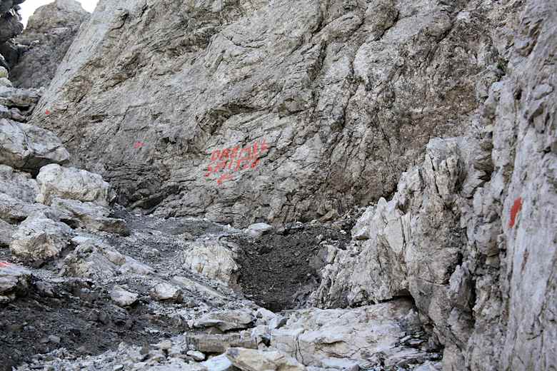 Am Beginn des Schuttkars geht es zunächst über Blockwerk, dann auf einem Pfad im Schutt nach oben zur Westlichen Dremelscharte mit dem frei stehenden Felsblock. Wenige Schritte unterhalb der Scharte zweigt nach links in einer breiten Schuttrinne der Einstieg zum rot markierten Dremelspitze-Normalweg ab, 2.425 m.