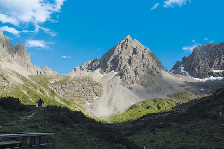 Faszinierend die Aussicht nach Westen zu den charakteristischen Bergmassiven von Freispitze, Vorderseespitze und Holzgauer Wetterspitze, eindrucksvoll aber auch der Blick nach Norden zu den Lechtaler Grasbergen hinter dem lang gestreckten Angerletal, durch das zu- und abgestiegen wird.