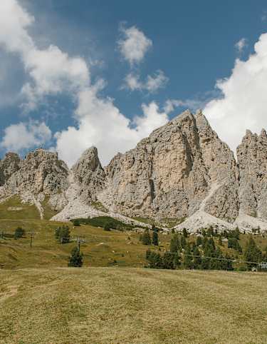 Der Abstieg beginnt links von der Hütte auf dem Weg 676 hinein in das Mittagstal und weiter über den Weg Nr. 651 zur Grödnerjochstraße.