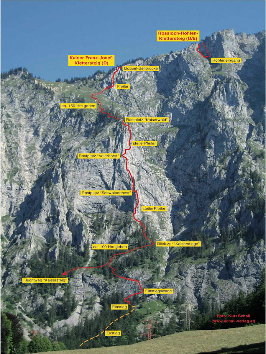 Siehe Topo (Anmerkung: wer schon in der Einstiegswand deutliche Schwierigkeiten hat, sollte unbedingt die Fluchtmöglichkeit über den Kaisersteig links abwärts zum Wandfuß benützen!). Beim Ausstieg lohnt sich noch die kleine (nicht zwingende) Mutprobe über die Doppel-Seilbrücke (toller Tiefblick zum Leopoldsteiner See!).