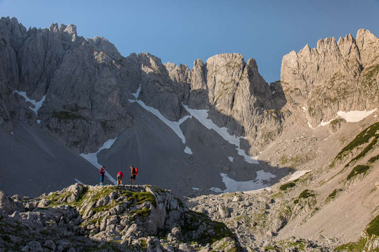 Der Abstieg vom Felsen erfolgt auf demselben Steig wie der Aufstieg bis hinunter ins Kar. Hier geht man links etwas weiter in das Tal hinein und gelangt zur nicht bewirtschafteten Fritz-Pflaum-Hütte. Der weitere Abstieg führt durch das Große Griesner Kar, zu dessen Seiten die Wände der Fleischbank und des Mitterkaisers aufragen. Schließlich wandert man dem Kaiserbach entlang zurück zum Ausgangspunkt.