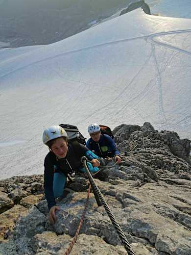 Ausrüstung: Klettersteigset, Helm, feste Bergschuhe, Gletscherausrüstung (Seil, Steigeisen, ev. auch Pickel od. Eisgerät für die Randkluft), 1-2 Schraubkarabiner zum sichern