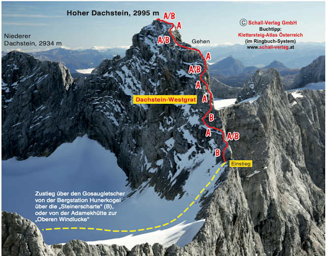 Randkluftsteig: Über die Randkluft (manchmal problematisch, vor allem im Spätsommer bei Ausaperung!) zum Beginn der Sicherungen und anfangs in einer Rinne (B), dann rechts der rinnenartigen Schlucht (A-B, zuletzt A) steil aufwärts zum Gipfel des Hohen Dachsteins.