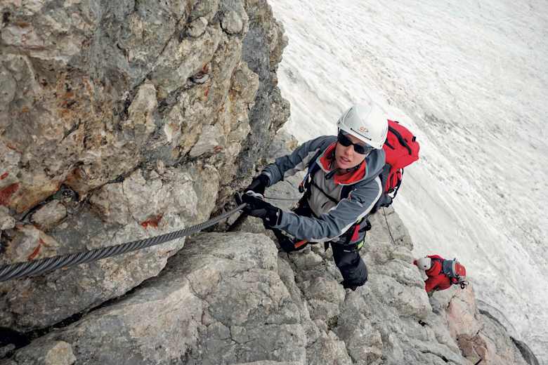 Schulter-Klettersteig: Über eine Steilstufe (B/C) und dann immer entlang des NO-Sporns (A/B und B) zur sog. „Schulter“ aufwärts. Über das flache Gratstück (A u. A/B, oft kurze Schneefelder) zum sich aufsteilenden Ostgrat. Noch etwa 15 m über eine Wandstufe und gestuften Fels (B) aufwärts zum sog. „Mecklenburgband“ (Gedenktafel). Nun auf dem von Überhängen überwölbten Felsband (durchwegs A/B und B, ausgesetzt; durchgehendes Stahlseil, aber öfter vereist!) rechts leicht absteigend die Nordwand queren zur Vereinigung mit dem Randkluftsteig, den man oberhalb des Einstieges erreicht.