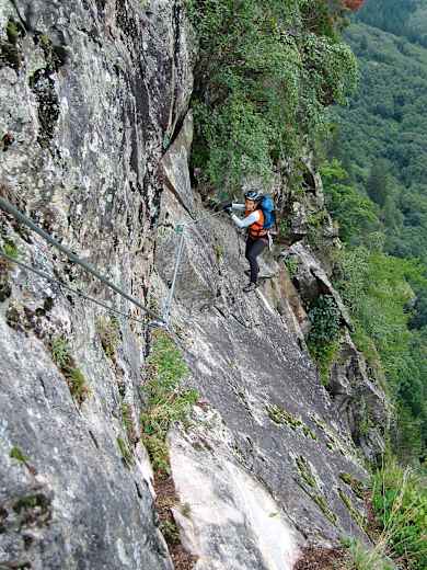 - Ausrüstung: Klettersteigset, Helm, mittelfeste Bergschuhe od. Kletterschuhe
