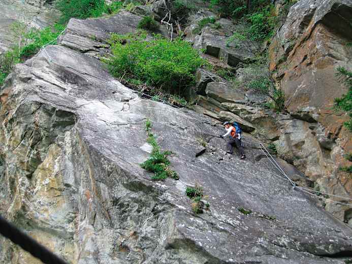 - Sicherungen: super; durchg. Stahlseil (großteils doppelt geführt - das dünne zum Sichern, das dicke als “Handlaufseil”), Klammern, Bügel, Stifte, Seilbrücke; eine Passage mit künstl. Griffen