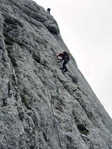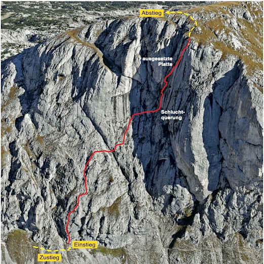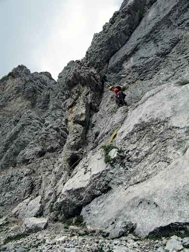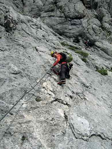 Im Einstiegsbereich besteht Steinschlaggefahr durch Vorausgehende (Helm bereits beim Zustieg unter der Wand aufsetzen!)