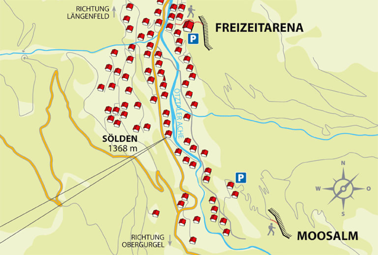 Über die A12 Inntal-Autobahn bis zur Abfahrt Ötz/Haiming. Weiter durch das Ötzttal nach Sölden. Durch Sölden bis zur Talstation Gaislachkoglbahn. Bei der Ausfahrt K dem Straßenverlauf ca. 300 m folgen und danach über die Brücke östlich hinauf in die Plattestraße, später Moosalmstraße. Nach ein paar Kehren erreicht man die Moosalm.