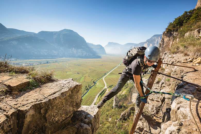 An den Osthängen des Etschtals führt der Fennberg-Klettersteig in Südtirol in abwechslungsreicher Linie zu einem versteckten See. Großartige Aussicht von steilen Leitern ist garantiert.