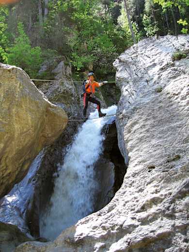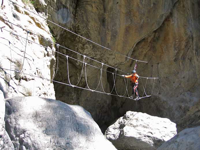 Interessant schon zu Beginn die beiden alten Wassermühlen, welche noch im Urzustand erhalten sind. Über eine Vielzahl an gesicherten Blöcken und kl. Bachüberquerungen geht es aufwärts zum eigentlichen Klammbeginn bei der ersten Einseilbrücke. Danach ein steiles Wandl auf der anderen Schluchtseite zur originellen V-Seilbrücke (hier sind zwei Mitlaufseile angebracht, in welche man die Klettersteig-Karabiner einhängt). Die herrlichen Tiefblicke zum tosenden Wildbach und die landschaftlichen Highlights wie Wasserfälle und sonnige Bach-(Rast-)Plätze lassen die kurzen, schwierigen Klettersteigpassagen kaum wahrnehmen.