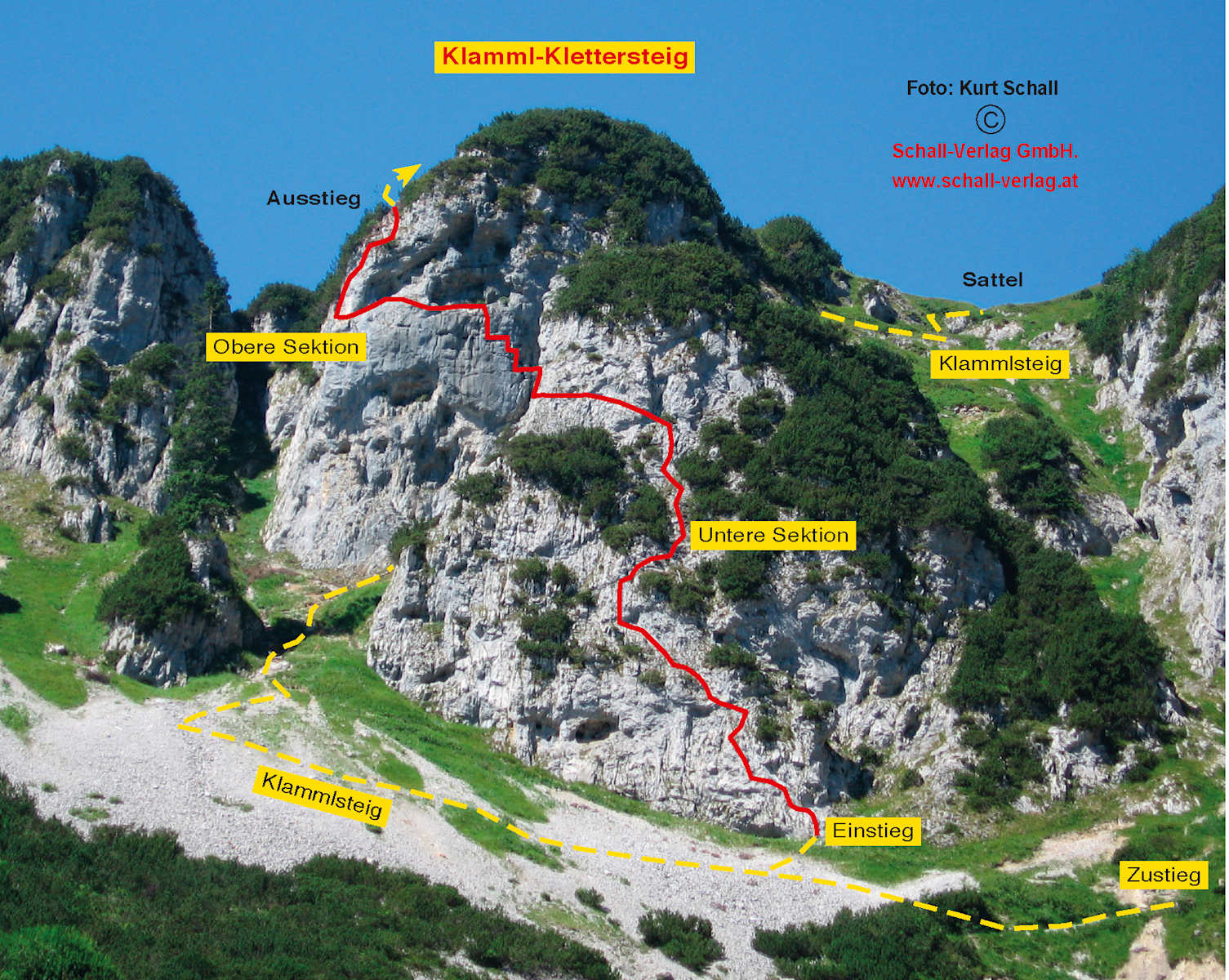 Siehe Topo. Die „Untere Sektion“ führt mit max. Schwierigkeiten bis C zur Zweiseilbrücke, welche die untere (leichtere) Sektion mit der oberen (schwierigeren) Sektion verbindet. Vor der Seilbrücke besteht eine einfache Fluchtmöglichkeit zum „Klammlsteig“. Wer bisher schon Probleme hatte, sollte keinesfalls über die Seilbrücke zur „Oberen Sektion“ einsteigen, welche mit einigen C/D-Stellen und einer D-Passage deutlich schwieriger ist. Vom Ausstieg der „Oberen Sektion“ über ein Latschensteiglein 5 Minuten aufwärts zur Vereinigung mit dem Wanderweg zur Gruttenhütte, welche von hier in wenigen Minuten erreicht werden kann. Achtung: In der „Unteren Sektion“: keine Steine lostreten, welche die Wanderer am unterhalb der Wand befindlichen „Klammsteig“ gefährden würden!