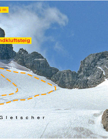 Jenseits Abstieg durch gestuftes Gelände, dann oberhalb eines Geröllfeldes fallende Linksquerung unter einem eindrucksvollen Felsband. Eine kurze Steilstufe empor (Klammern, B-C) und über ein schönes Band hinab zum Gosaugletscher (Randkluft). Nach Norden durch die Gletschermulde abwärts (Spalten) und auf 2.500 m allmählich rechtshaltend mit etwas Abstand zur Felswand an dieser entlang und schließlich hinauf zum Einstieg, Randkluft, 2.480 m. 1 h.