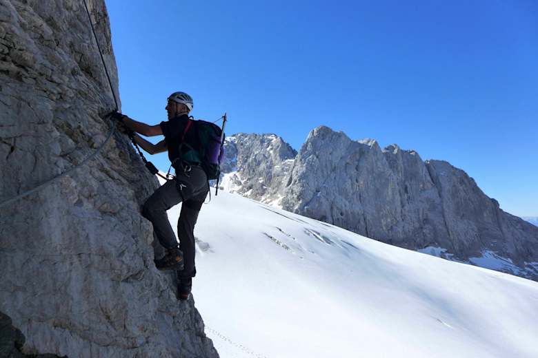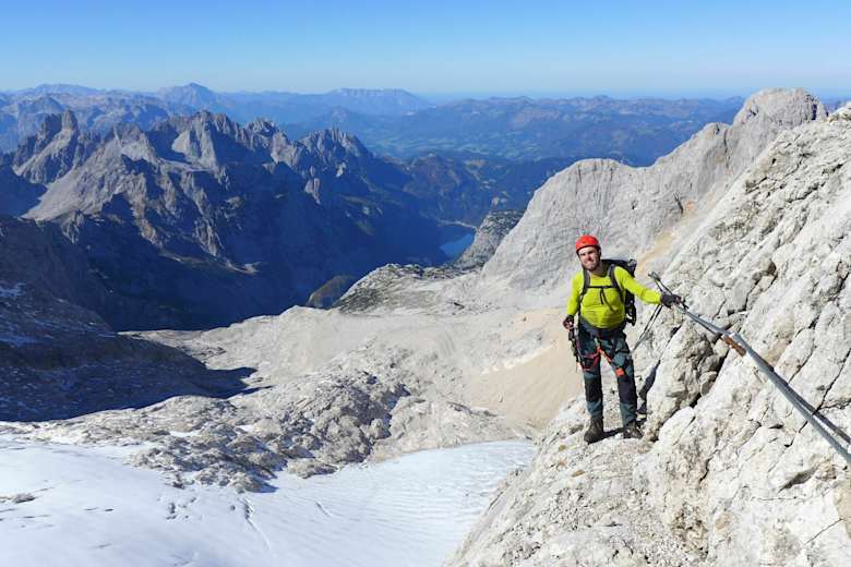 Amon-Klettersteig (C/D): Die Kombination Klettersteig und Gletscher klingt für ambitionierte Klettersteiggeher sehr verlockend, und der Amon-Klettersteig wird diese Alpinistengruppe sicher zu Begeisterungsstürmen hinreißen. Denn Landschaft, Felsqualität, Routenverlauf und die zu Recht nicht übertriebenen technischen Schwierigkeiten ergeben eine Mischung, die in dieser Form und mit dieser Intensität der Bergerlebnisse einzigartig ist. Das Hochtourenknowhow bildet dabei die Grundlage für den Klettersteiggenuss, der im Zu- und Abstieg auf vielfältige Art und Weise ausgestaltet werden kann. Lohnender Klettersteig im Dachsteingebirge in Oberösterreich.