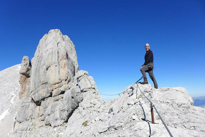 Fantastische Tagestour inkl. Dachstein-Gipfel: Bergstation Hunerkogel – Dachstein-Überschreitung (Schulter – Westgrat) – Gosaugletscher – Amon-Klettersteig – Hohes Kreuz – zurück zur Simonyscharte – Hallstätter Gletscher – Bergstation Hunerkogel