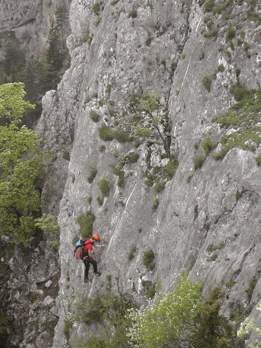Geeignet für Kinder ab 15 Jahren. Exposition Südost. Sicherungen durchweg gut mit durchgehendem Stahlseil, Trittstifte, Klammern. Keine Fluchtmöglichkeiten.