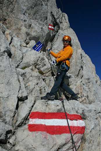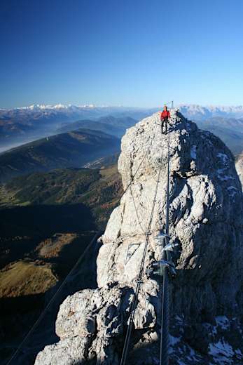 Schräg rechts über ein kurzes steiles Wandl zu einem luftigen Eck (C). Dann eine leichte Linksquerung (keine Steine auslösen!) und steil aufwärts unter die auffällige gelbliche Wandzone (C). Durch diese hindurch (mehrere steile Passagen und spektakuläre ausgesetzte Querungen mit tollen Tiefblicken, Stellen C-D). Ausstieg links auf einem Grat (Felsloch) und weiter über die scharfe Gratschneide zum Beginn eines leichteren Abschnitts (aussichtsreicher Rastplatz). 1 h. Über die folgenden Grataufschwünge zu einer kurzen geneigten Platte. Dann wieder ein steiler Abschnitt (C-D) zu einem Absatz. Schräg links über ein steiles Wandl (C-D) und zur nahen Einmündung in den Koppenkarstein-Nordostgrat und damit zum Ende der Schwierigkeiten, ca. 2.790 m. Den Sicherungen folgend über den leichten Grat (A-B) zum vom Bundesheer „besetzten“ Gipfel des Großen Koppenkarsteins (Sender, Betriebsseilbahn). 1 h.