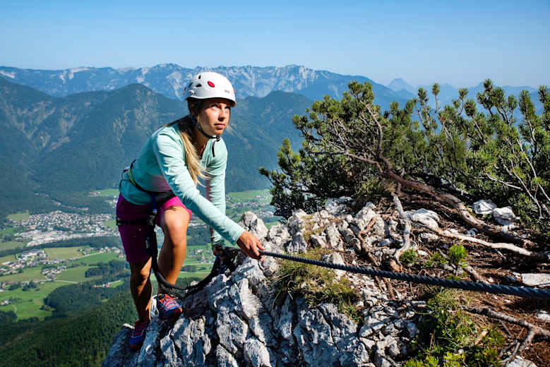 Von der Bergstation der Beschilderung zum Klettersteig folgend nach Osten in Kürze hinab zur Katrinalm. Im Sattel links einschwenken und auf dem grünen Pistenband abwärts, dabei bald unter der Seilbahn durch. Nach einem Rechtsbogen (Blick ins Höllengebirge und auf Bad Ischl) weiter hinab zur Abzweigung zum Klettersteig, 1.360 m. Links ab mit roter Markierung auf einem waagrechten Steig, zunächst durch Latschen, dann im Wald.