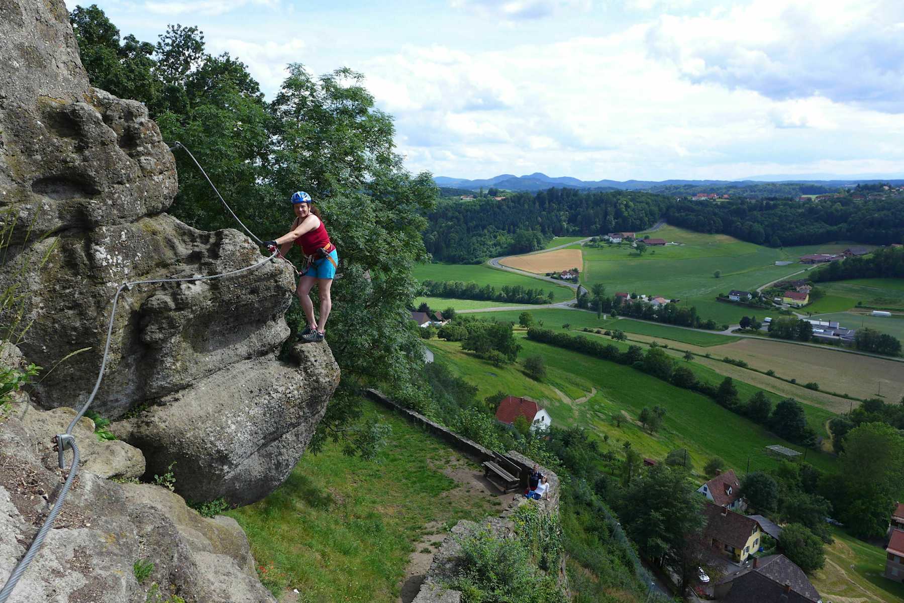 Leopold- und Heinrich-Klettersteig (C, Var. D): Was für ein genialer Geistesblitz, durch die Vulkanfelsen der Riegersburg einen Klettersteig zu errichten. Der initiale Leopold-Klettersteig hat schon zwei Erweiterungen erhalten, sodass das ursprünglich eher kurze Klettersteigerlebnis nun ausreichend intensiviert werden kann. Die Schwierigkeiten sind bis auf die „Verlängerung“ mäßig, die Route ist aber auf weiter Strecke maximal ausgesetzt und daher gar nicht ohne, vor allem weil es teils recht trittarm zugeht.