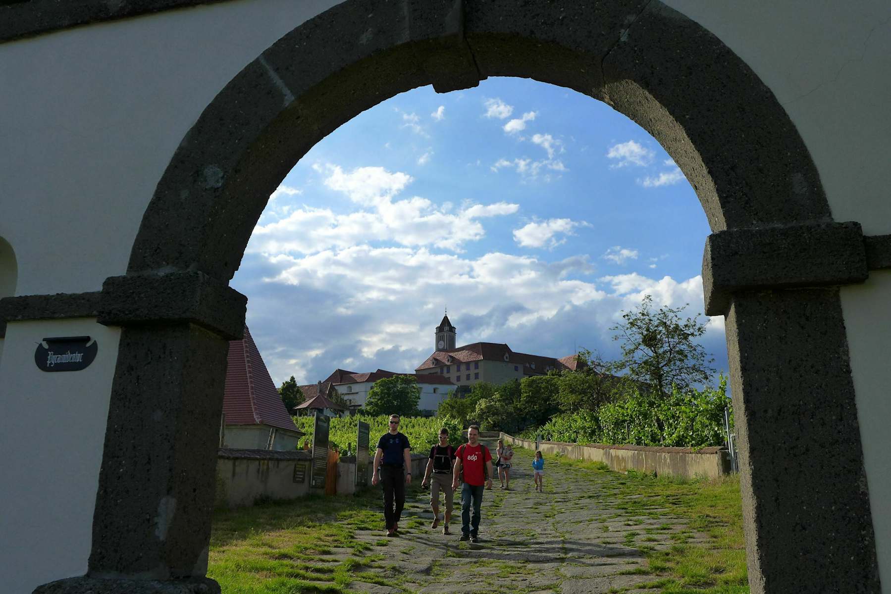 Vom Friedhofsparkplatz nach Südosten in den Ort und links zum Eingang ins Gelände der Riegersburg (Eintritt). Auf dem Burgweg hinauf zur ersten Kehre (Infotafel) und über eine ebene Rasenfläche (Kinderrutsche) zum Einstieg unter der Burgmauer, 400 m. 15 Min.