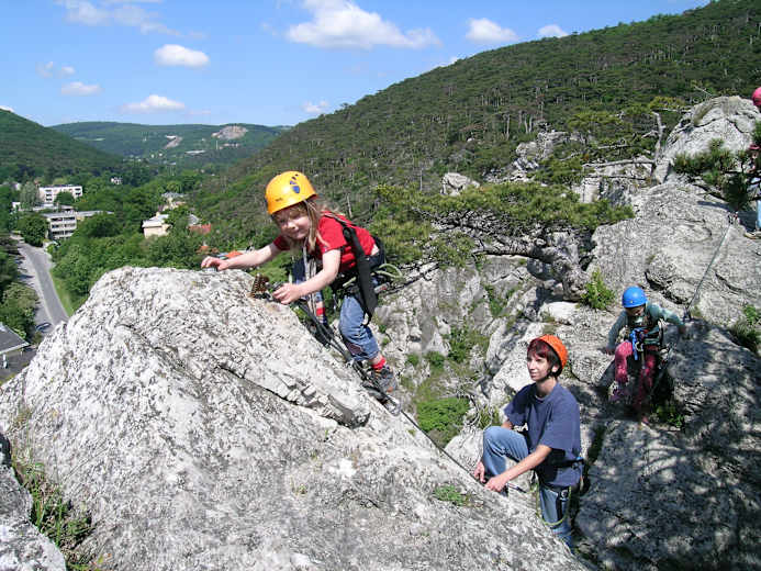 Mödlinger-Klettersteig (B/C): Auch der Wienerwald hat einen echten Klettersteig, den „Klettersteig der Stadtgemeinde Mödling“ im Wienerwald. Seinem alpinen Umfeld gemäß ist er ein kleiner aber feiner Steig. Einer für Anfänger und Kurse sowie Schnupperer, die in die Felsenwelt eintreten wollen. Ebenfalls einer für einen lauschigen Nachmittagsbesuch, aber auch – für die, die es härter wollen – für ein hochwinterlich-kaltes Abenteuer. Günstige Erreichbarkeit, Kürze, vergleichsweise geringe Schwierigkeiten und das Biedermeier-Ambiente der romantischen Landschaft vor den Toren Wiens tragen zu seiner Beliebtheit bei.