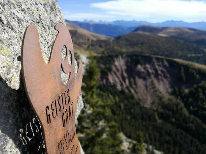 Den Gipfel des Kleiner Ifinger (2.552 m) erreicht man dann über einen kurzen Aufschwung. Der Klettersteig erinnert an Heini Holzer, Steilwandabfahrer und Alpinist aus Schenna, der die 55° steile Rinne an der Ifinger-SW-Flanke in den 70er Jahren mit den Skiern abgefahren ist. Eine grandiose Route in atemberaubender Umgebung in den Sarntaler Alpen in Südtirol.