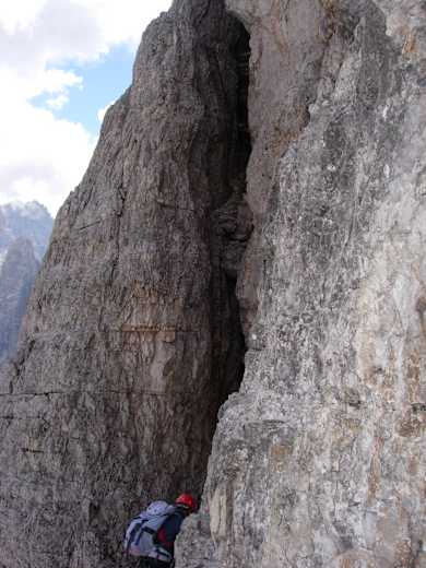 Ausgangspunkt des Klettersteiges ist die Auronzohütte. Von dort führt ein breiter Weg an der Kapelle der Alpini vorbei bis zur Lavaredohütte. Weiter geht es leicht bergauf bis man den Paternsattel erreicht.