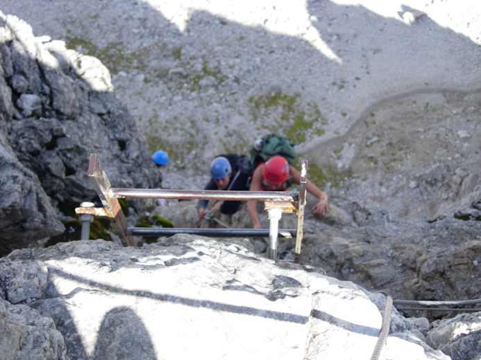 Der Toblinger Knoten wird linksseitig umgangen und durch ein Mit Drahtseilen gesichertes Horizontalband gelangt man zum Einstieg des „Dolomitenfreunde- Klettersteigs“. Von dort an beginnt eine Serie an Leitern, über welche es in Richtung Gipfel geht. Insgesamt sind es 17 Stück. Einer der Höhepunkte des Klettersteiges ist der Zwergentod, ein breiter Kamin, in dem man von einer Wandseite in die andere wechselt.