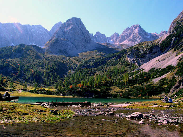 Der (alpine) Abstieg erfolgt auf einem steilen Pfad mit Seilversicherung (A/B). Man quert den Steilhang und wandert zum Drachensee hinunter. An dessen Ufer gelangt man zur Coburger Hütte, von der man steil zum Seebensee hinabsteigt. Über den „Hohen Gang“ kommt man zurück zum Ausgangspunkt, 2:30 h.