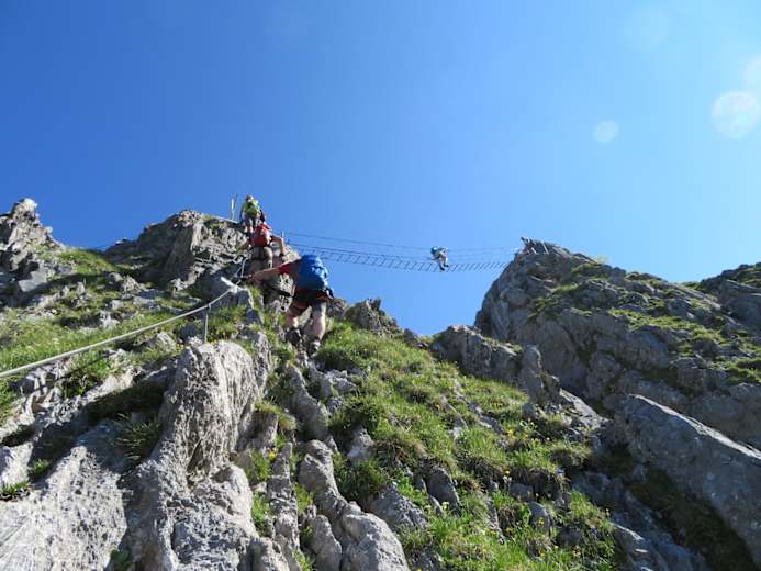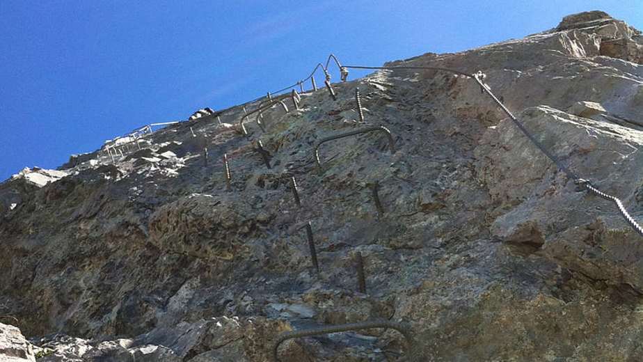 Oben angekommen findet man zwei Steige vor, die sich mehr oder weniger nebeneinander befinden. Man wählt den östlichen der beiden Klettersteige über den Rigidalstockgrat.