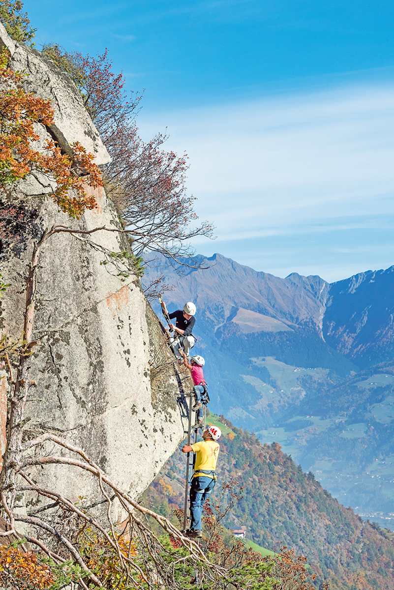 Toller Übungs- und Familienklettersteig am „Knott" (Fels) in Unterstell, oberhalb von Naturns im Vinschgau. Dieser Felsen bietet einfache Routen, schwierige Passagen, exponierte Wegstrecken und technische Abschnitte sowie eine luftige Seilbrücke und zwei steile Leitern. Am „Knott" in den südlichen Ausläufern der Ötztaler Alpen in Südtirol kann man klettern so viel und so lange man will.