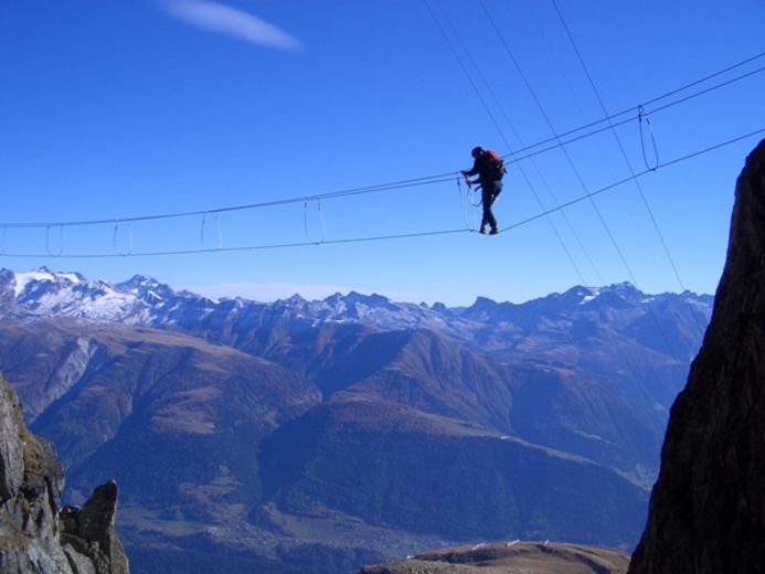 Dieser führt durch kompakten Fels und über imposante Felsformationen und eröffnet immer wieder traumhafte Ausblicke auf das Sonnenplateau mit Riederalp, Bettmeralp und Fiescheralp. Als Höhepunkte gibt es eine Dreiseilbrücke (40 m), eine Hängebrücke (30 m) und eine Tyrolienne (30 m). Nach rund 2 h herrlicher Kletterei und dem Überwinden von 305 Hm gelangt man zurück zum Eggishorn.