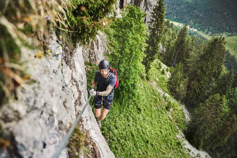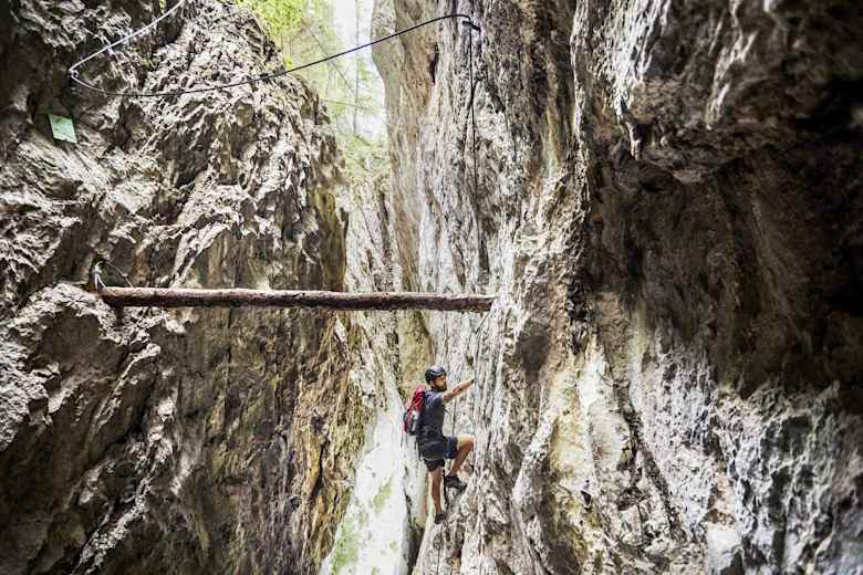 Dort kommt „Höhlenforscher-Feeling“ auf: Durch ein mächtiges Felsgewölbe klettert man nach oben, balanciert auf schmalem Baumstamm über einen tiefen Abgrund und schlüpft oberhalb wieder ans Tageslicht. Derzeit eine der genussvollsten Klettersteig-Neukreationen am Alpenostrand: landschaftlich top, steil und durchaus fordernd – aber nicht überfordernd.