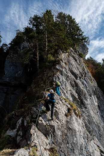 Sie wird schräg ansteigend erstiegen (meist Klammern, B, zuletzt B/C). Danach über einen breiten, erdigen, felsdurchsetzten Waldrücken hinauf (Geländerseil, A). Schließlich quert man hinaus in die Schlusswand. Über sie schräg nach rechts oben (B), zuletzt in der Falllinie (B/C) hinauf zum Ausstieg im Waldgelände (Baum mit Steigbuch und Spendenkassa, Bank).