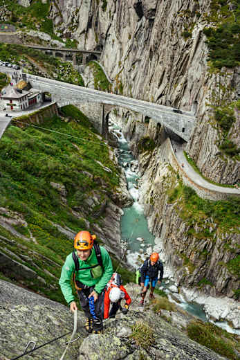 Der nicht allzu schwere Diavolo Klettersteig bei Andermatt im Kanton Uri bietet eindrücklichen Kletterspass für die ganze Familie und ist auch für schwindelfreie Anfänger geeignet. Mit 700 m Drahtseil, 265 Eisenstiften und Haken, künstlichen Tritten und zwei Leitern führt die spektakuläre Route in den Granitfelsen der Schöllenen, allerdings mit reichlich Gras dazwischen. Faszinierend sind die Tiefblicke in die wilde Schlucht und ihre Verkehrswege sowie die umliegenden Urner Alpen.