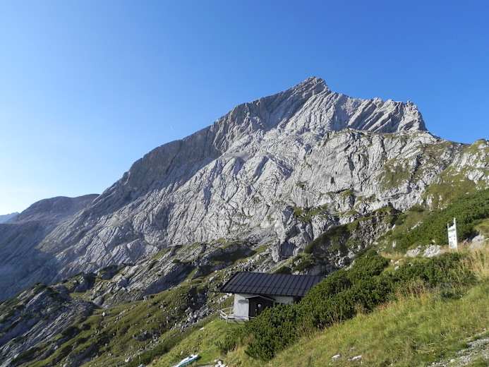 Über Geröll und Schotter steigt man durch das Kar abwärts und erreicht schließlich Latschengelände. Durch dieses steigt man hinunter zur Höllentalangerhütte. Hier kann man sich endlich eine Erfrischung gönnen.